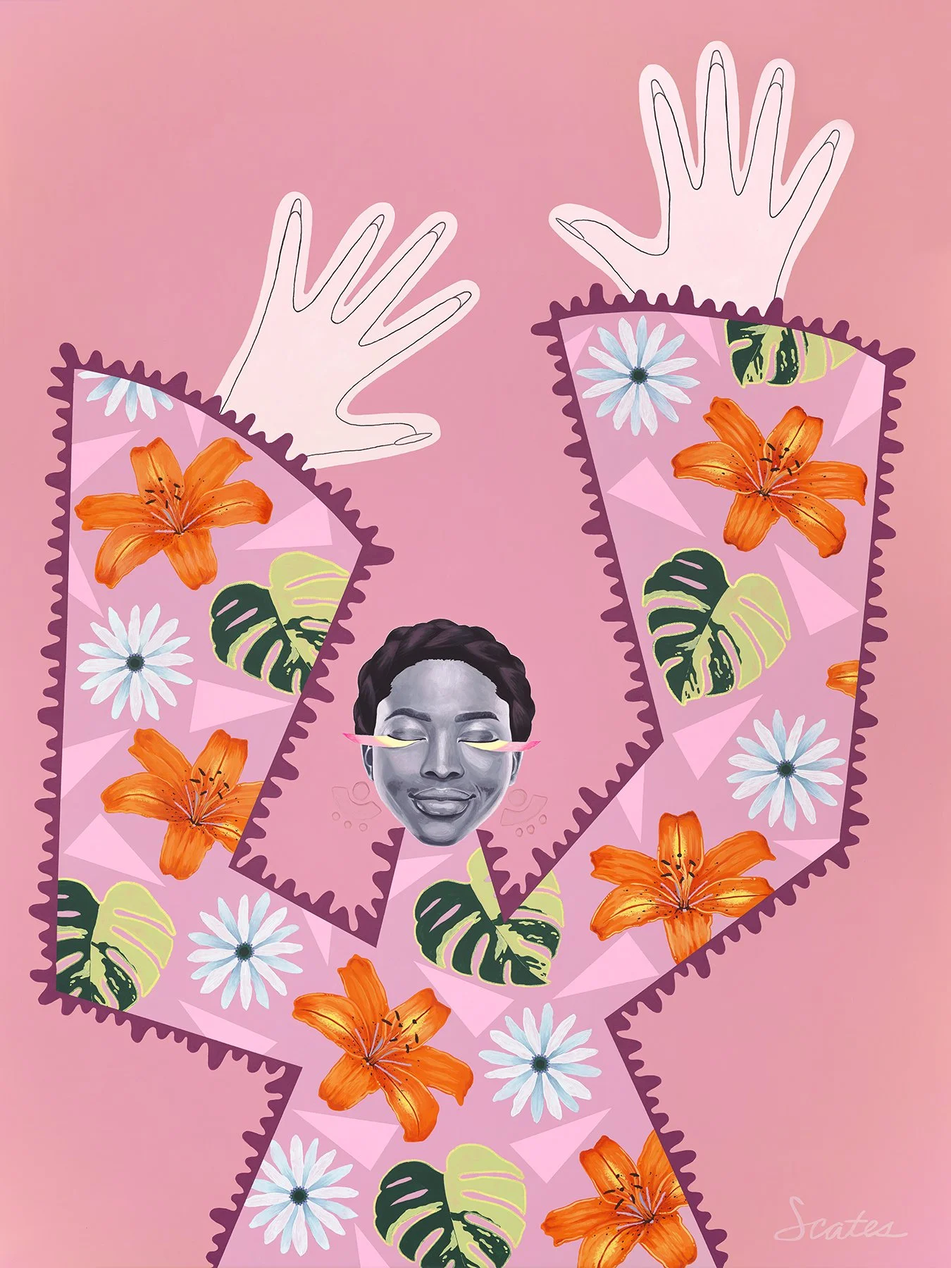The ‘Get Your Rest’ series is inspired by my own need to let go, my own desire to chase my fears, and recognition of the level of creativity I’ve been blessed with. The artwork features a woman with her hands in the position of surrender with emphasis on her open hands – both ready to receive and ready to give. It is a peaceful submission. It is a surrender to purpose and intention. Visually, it is also meant to represent a return to my inner child for the purpose of healing that child before moving forward. This is expressed through the style and playfulness of the flowers in her shirt. I want peace that surpasses understanding. I want rest. I want that for you too.